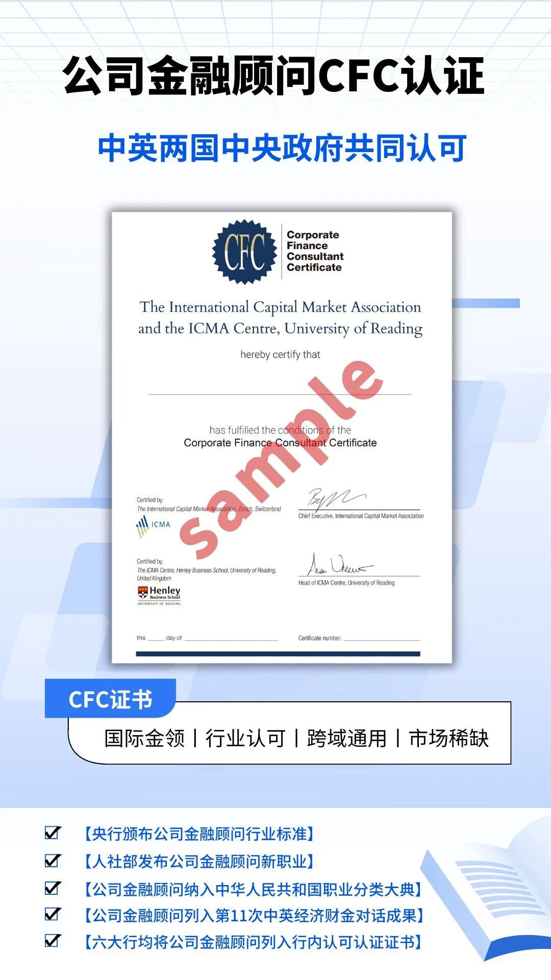 公司金融顾问CFC认证 公司金融顾问(Corporate Finance Consultant,简称 CFC)国际金融认证知识体系,是专为面向企业提供投融资规划、金融架构设计等专业服务的从业人员打造的认证知识体系。该体系不仅率先实现与国际先进金融体系的深度接轨,更是严格依据《公司金融顾问》金融行业标准研发的新职业认证体系。 作为经国家认证的金融行业新职业,公司金融顾问(CFC)聚焦于帮助金融机构与企业建立全球化的公司金融视角,系统掌握境内外企业投融资管理体系及金融市场运行逻辑。其核心目标在于培养兼具国际市场规则洞察力与公司金融业务特性把控力的综合金融服务人才。